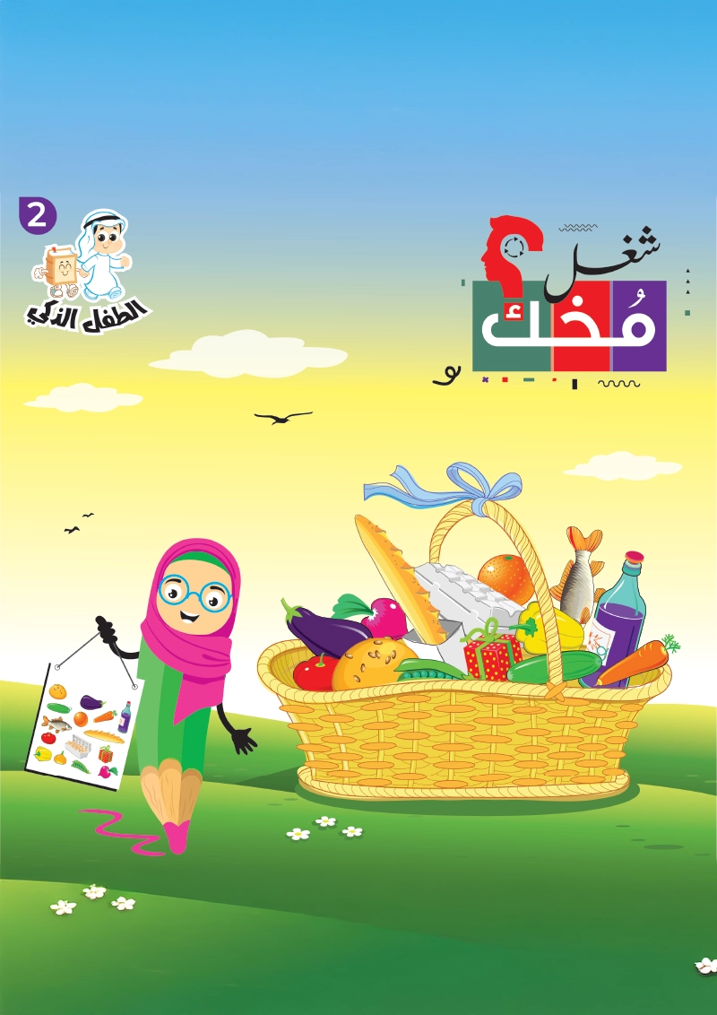 The workbook follows the popular “Use Your Brain / شغّل مخك” style, where every activity is printed on a big notebook page with a bright outdoor background and a friendly pencil character encouraging children as they play. Instructions are written in both Arabic and English, making this a powerful bilingual kids workbook that supports language learning alongside logic, maths and problem-solving.